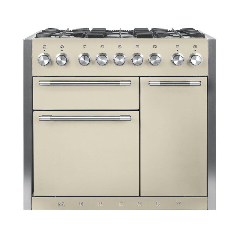 The Mercury 1000 range cooker delivers the perfect fusion of uncompromising quality, innovative design and peerless performance. With a large cooking area, multi-function electric fan ovens and a five-burner gas hob, the Mercury 1000 provides a true cooking experience.