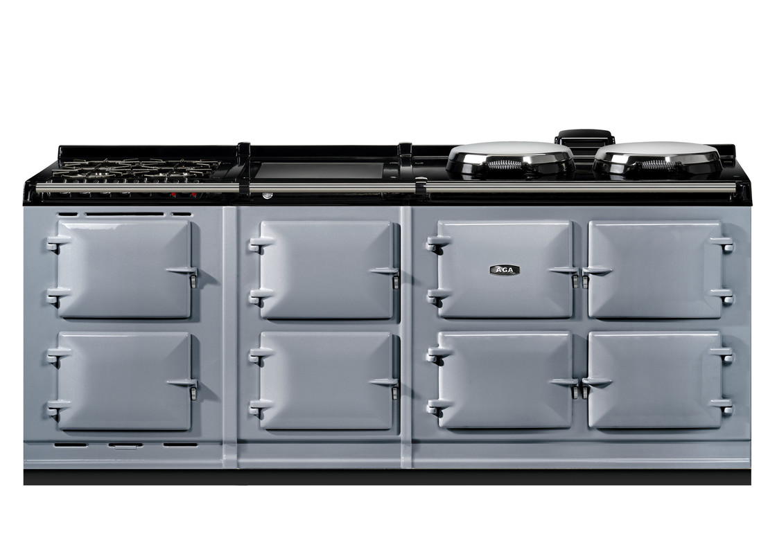 The AGA R7 210 features three cast-iron heat storage ovens for roasting, baking and simmering and offers two hotplates which can be switched on and off independently of the ovens, and each other, and heat up in 10 to 12 minutes. This model offers an additional grill, fan oven, warming oven and two slow cooking ovens, as well as a 4-burner gas hob and the choice of either a single-zone induction hob or a warming plate.