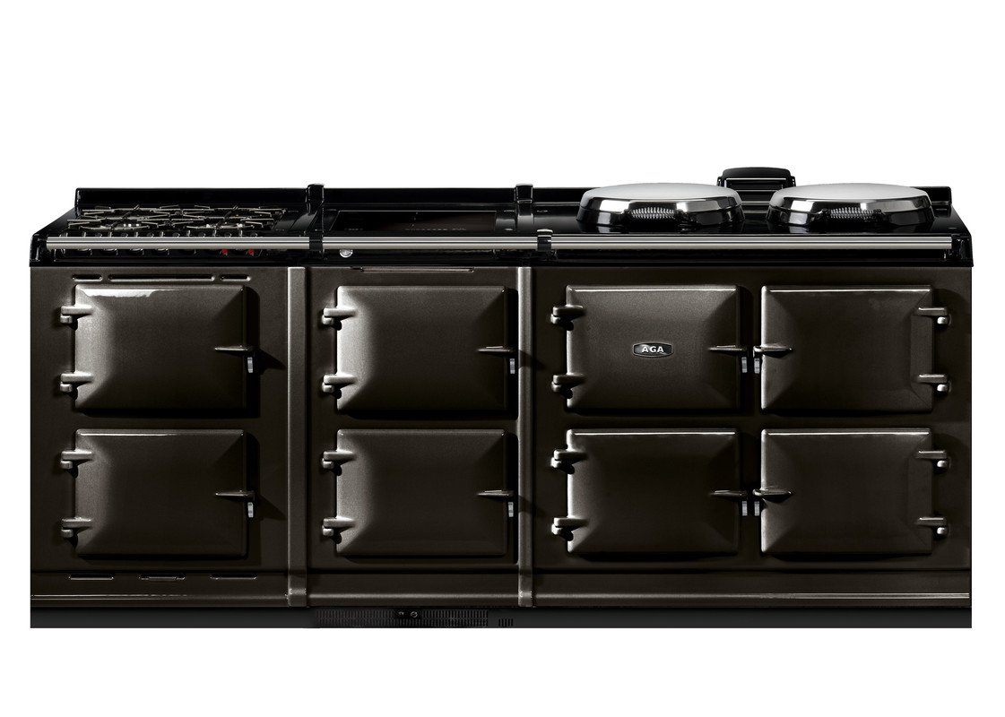 The AGA R7 210 features three cast-iron heat storage ovens for roasting, baking and simmering and offers two hotplates which can be switched on and off independently of the ovens, and each other, and heat up in 10 to 12 minutes. This model offers an additional grill, fan oven, warming oven and two slow cooking ovens, as well as a 4-burner gas hob and the choice of either a single-zone induction hob or a warming plate.