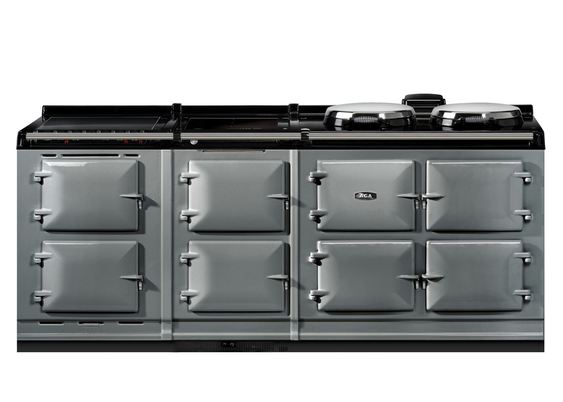 The AGA R7 210 features three cast-iron heat storage ovens for roasting, baking and simmering and offers two hotplates which can be switched on and off independently of the ovens, and each other, and heat up in 10 to 12 minutes. This model offers an additional grill, fan oven, warming oven and two slow cooking ovens, as well as a 4-zone ceramic hob and the choice of either a single-zone induction hob or a warming plate.